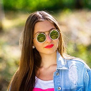 Outdoor portrait of beautiful, emotional, young woman in sunglas